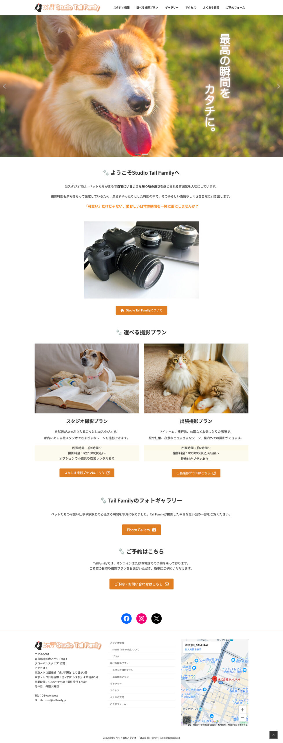 ペット撮影スタジオ URL https://abe.smml.info/stf/ 使用技術 WordPress 担当 デザイン・コーディング デザインについて 20〜50代の女性をターゲットに、明るいオレンジをメインにグリーンを差し色として使用しました。ポップで温かみのある雰囲気を意識し、ペットが主役となるよう写真を大きく配置しています。 コーディングについて