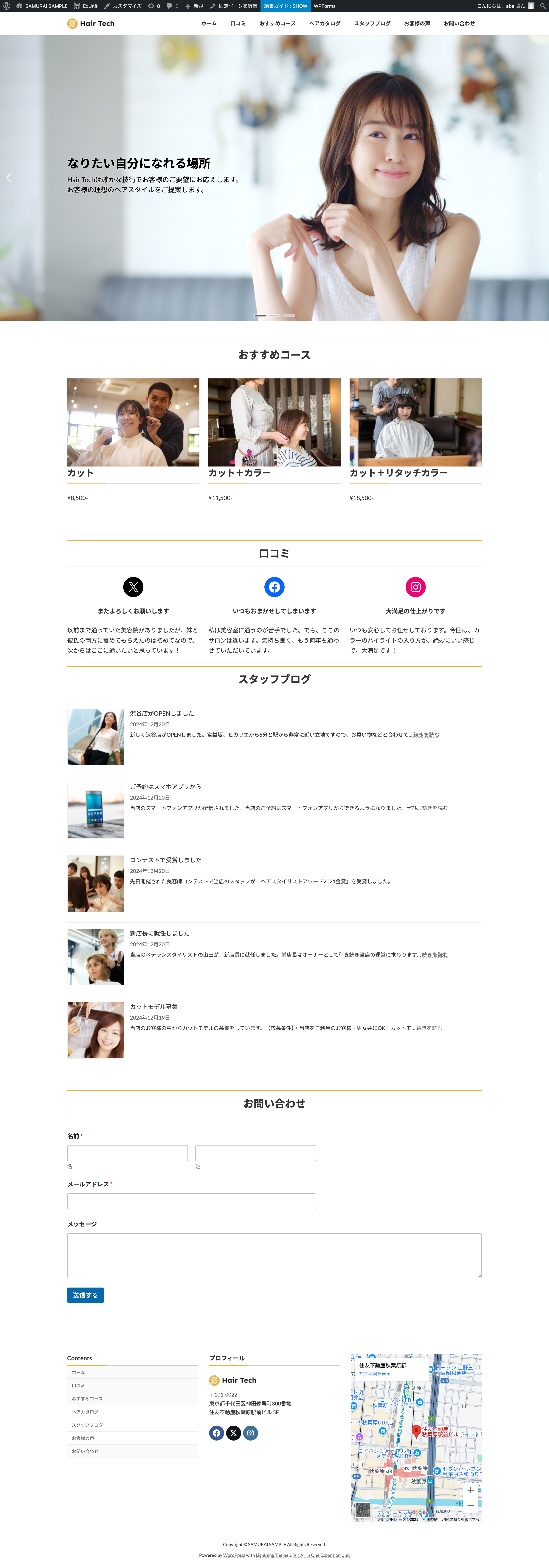 トップ画面での画像スライド、口コミ情報の表示、GoogleMapでの店舗所在地の表示、お問い合わせフォームなどを実装させていただいております。